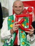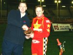 Jackie's Jason Yallop presents Rider Of The Night Trophy to Buzz Burrows at Wimbledon Speedway, April 2004