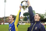 Captains Matt Everard and Joe Sheerin at Kingsmeadow with one of the cups AFC Wimbledon has won this season.