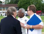 | Jackie's Alistair Wright at the crease with the two captains, Sir David English and Sir Trevor MacDonald